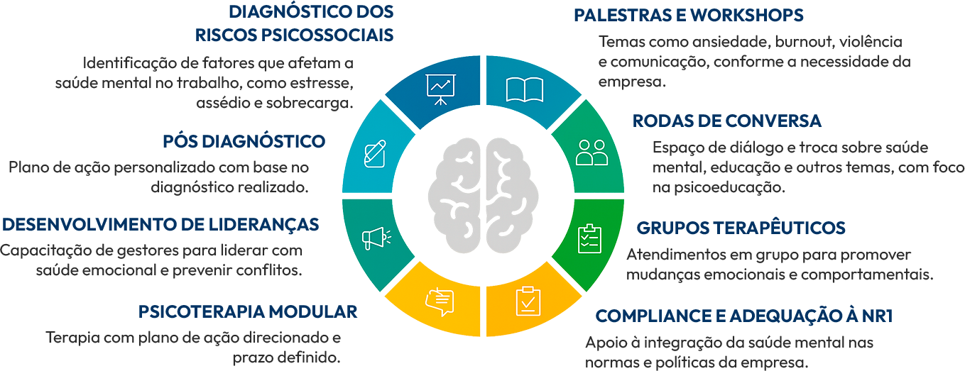 Temas como ansiedade, burnout, violência e comunicação, conforme a necessidade da empresa.